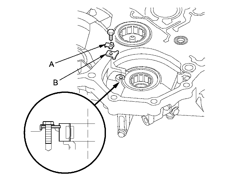 1. Remove the bolt, then remove the lock washer (A) and the bearing set plate (B).