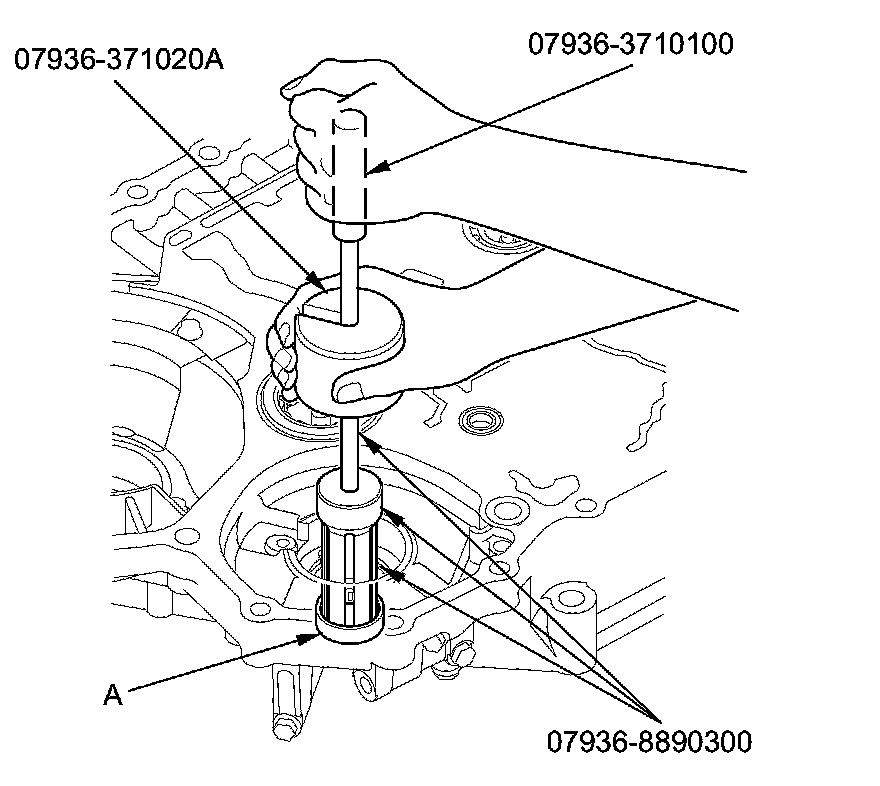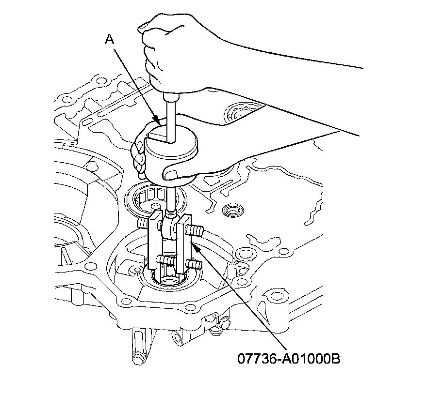 4. Remove the 29 x 39 x 9.5 mm secondary shaft bearing (A) from the torque converter housing using the 30 mm bearing remover shaft set, the remover handle, and the sliding hammer.