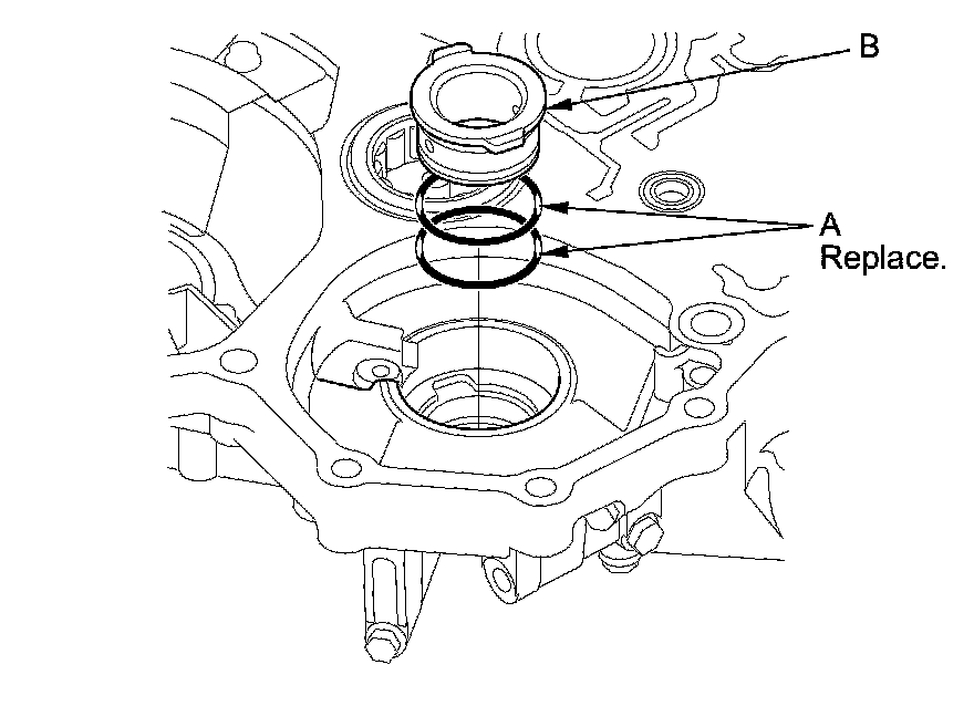 6. Install new O-rings (A) on the ATF guide collar (B), then install the guide collar in the torque converter housing.