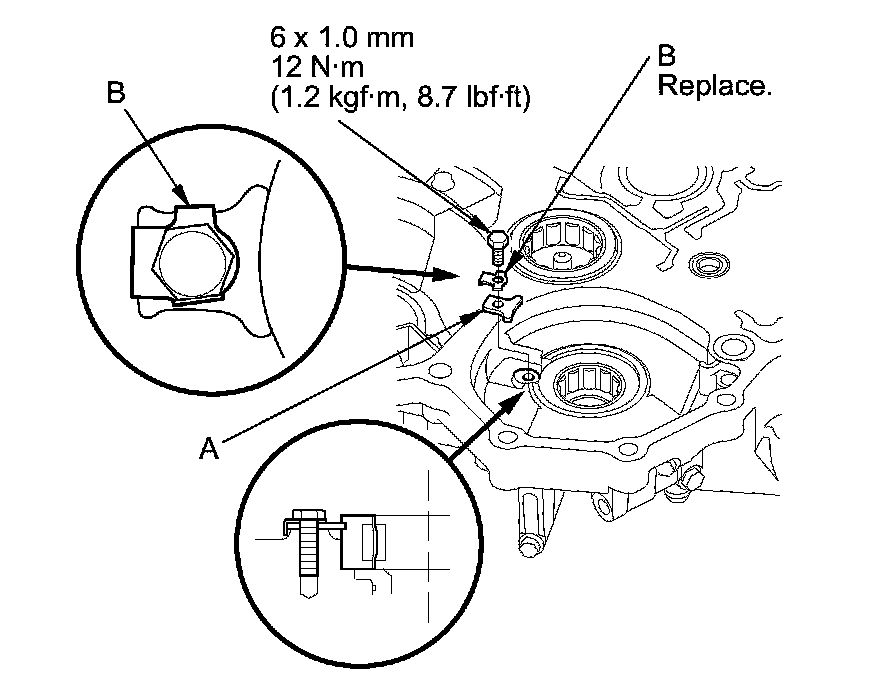 9. Install a new lock washer (B) and the bolt, then bend the lock tab of the lock washer against the bolt head.