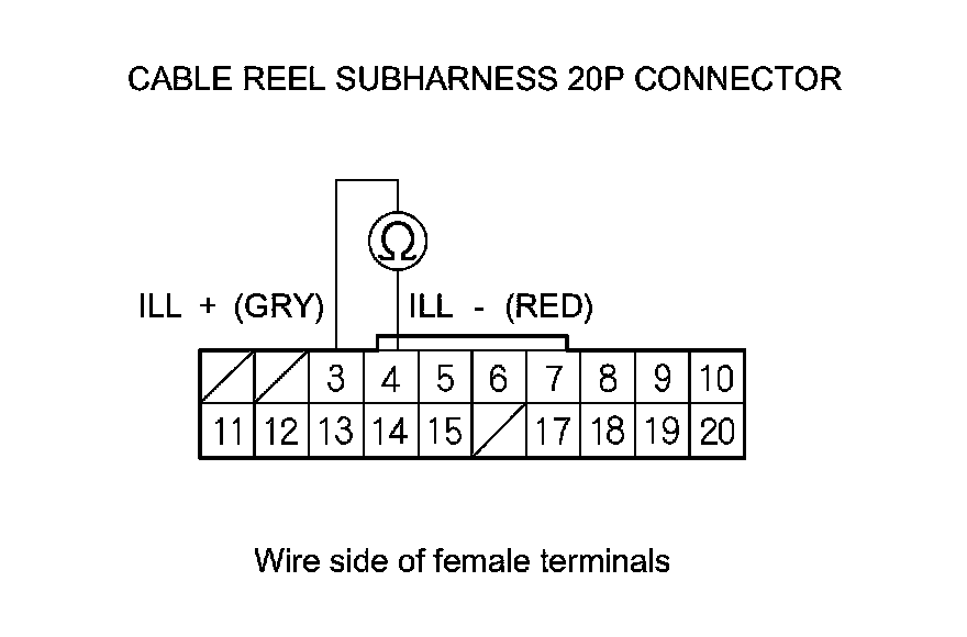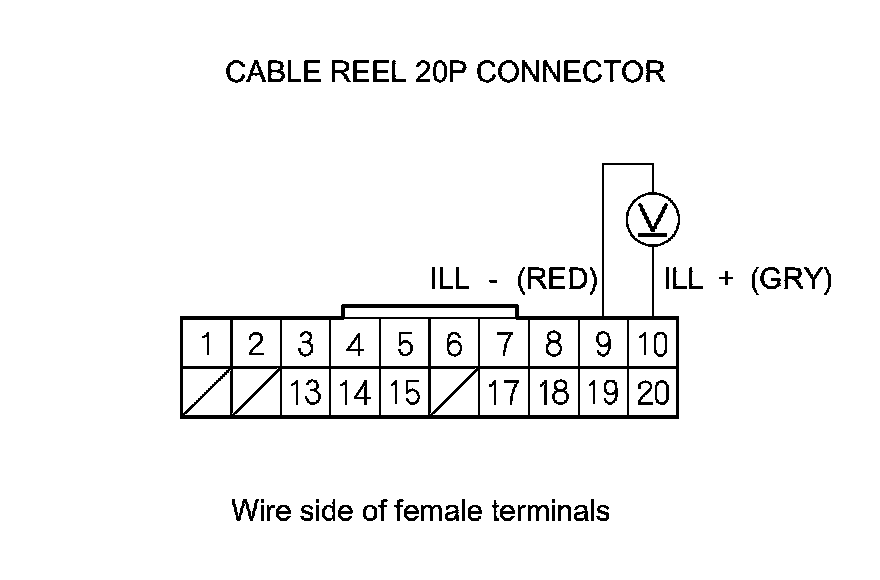 5. Measure the voltage between cable reel 20P connector terminals No. 9 and No. 10.