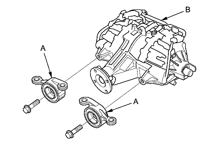 2. Remove the rear differential front mounting brackets (A) from the rear differential (B).