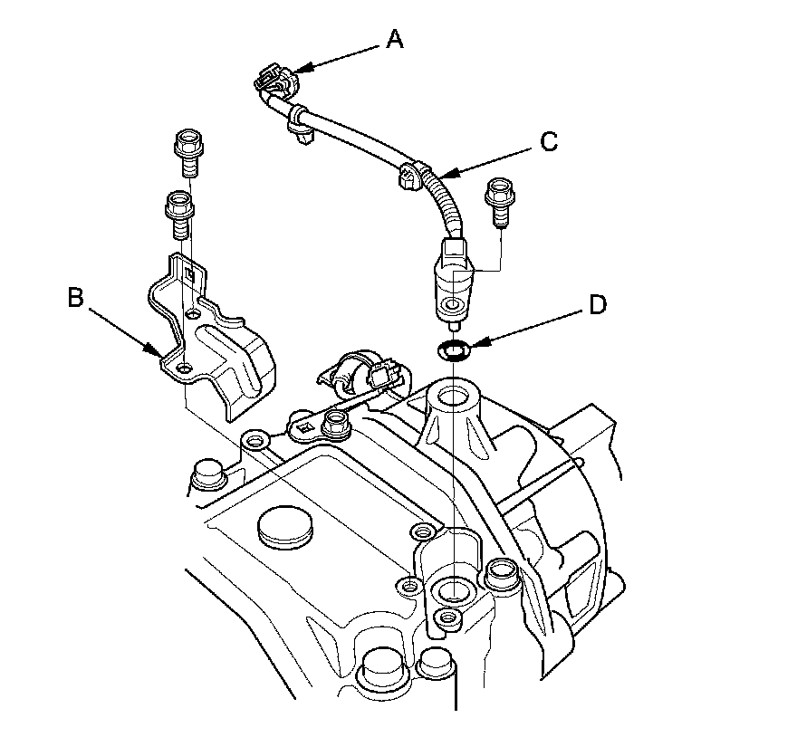 3. Disconnect the rear differential fluid temperature sensor 2P connector (A), then remove the rear differential fluid temperature sensor cover (B), the rear differential fluid temperature sensor (C), and the O-ring (D).