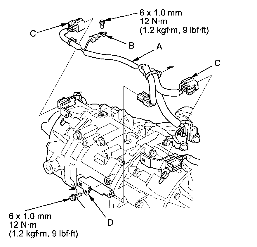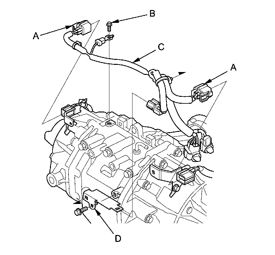5. Remove the ground cable bolt (B) and rear differential harness bracket D, then remove the rear differential subharness (C).