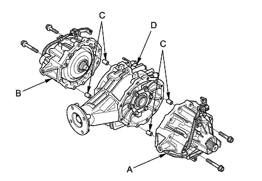 6. Remove the rear differential left side case (A), the rear differential right side case (B), and the 10 x 12 mm dowel pins (C) from the rear differential center case (D).