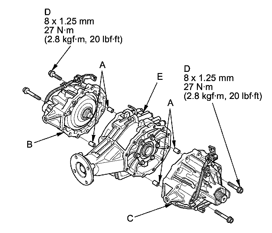 9. Install the 10 x 12 mm dowel pins (A), the rear differential right side case (B), the rear differential left side case (C), and the mounting bolts (D) onto the rear differential center case (E).