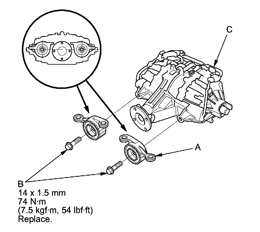 15. Install the rear differential front mounting brackets (A) with new bolts (B) on the rear differential (C).