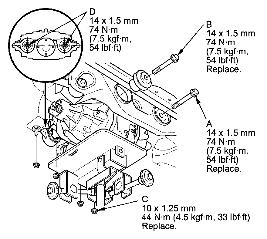 9. Tighten the rear differential front mounting bracket bolts (D) to the specified torque.