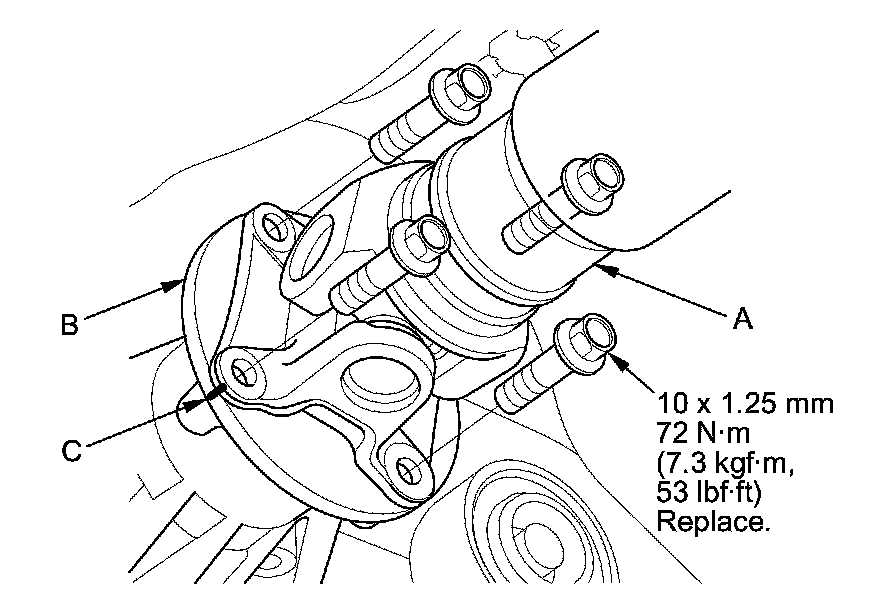 7. Tighten the rear differential rear mount bolt (A) and the rear differential front mounting bracket nuts (C) to the specified torque.
