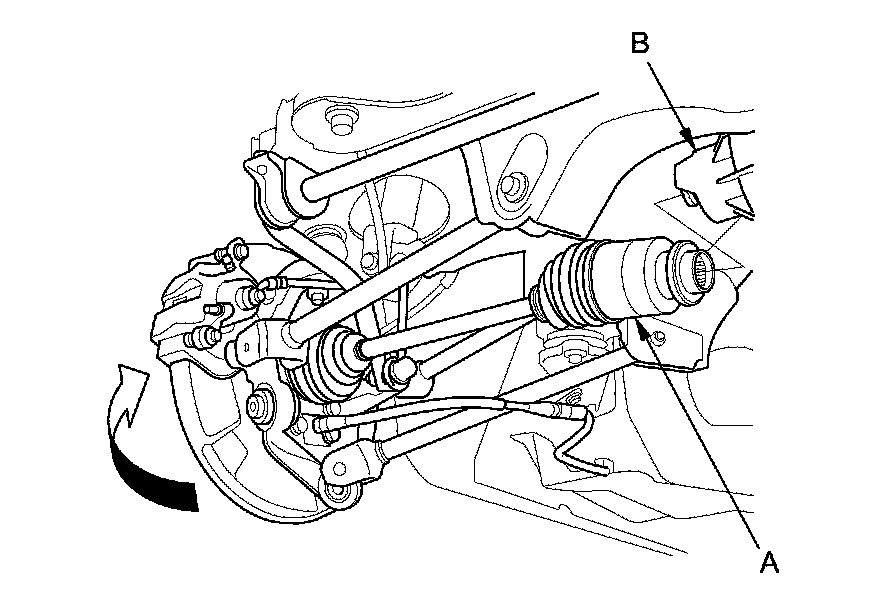 14. Pull the knuckle outward, and insert the rear driveshaft inboard joints (A) into the rear differential (B).