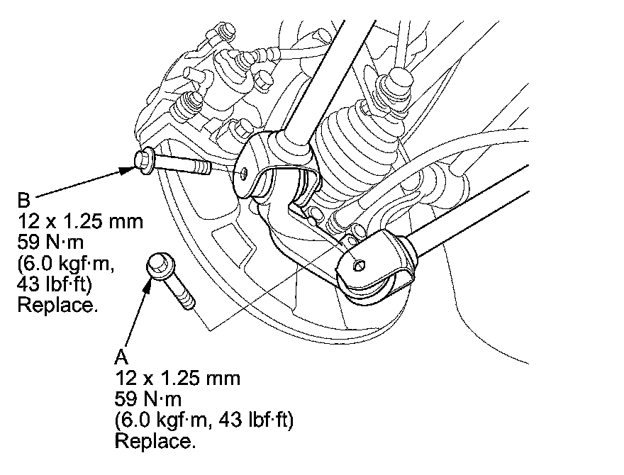 15. Loosely install new lower arm A mounting bolts (A) and new lower arm B mounting bolts (B).