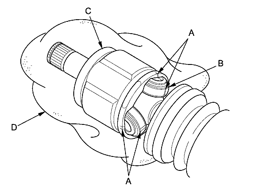 2. Make marks (A) on each roller (B) and the inboard joint (C) to identify the locations of the rollers to the grooves in the inboard joint.