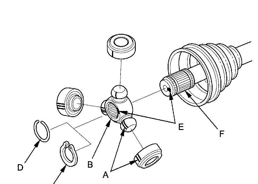 7. Make marks (E) on the spider and the driveshaft (F) to identify the position of the spider on the shaft.