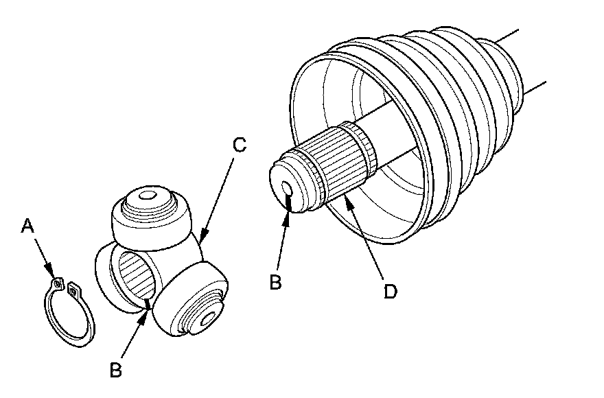 10. Make marks (B) on the spider (C) and the driveshaft (D) to identify the position of the spider on the shaft.