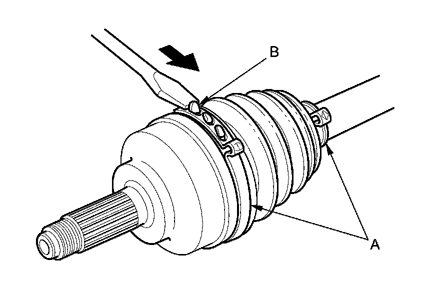 1. Remove the boot bands (A). Lift up the three tabs (B) using a screwdriver, then release the band. Be careful not to damage the boot.