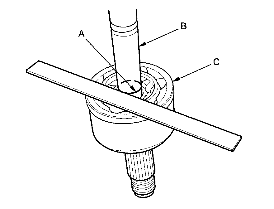 6. Remove the outboard joint (A) using the 26 x 1.5 mm threaded adapter (B) and a commercially available 5/8'' x 18 UNF slide hammer (C).