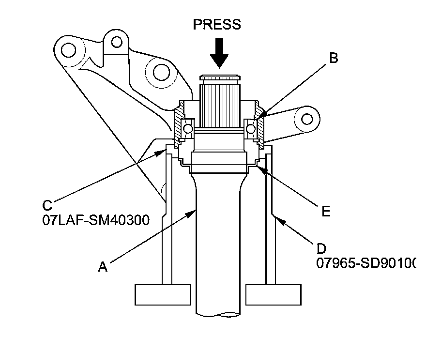 3. Press the intermediate shaft (A) out of the intermediate shaft bearing (B) using the support base attachment (C), the support base (D), and a press. Be careful not to damage the bearing support ring (E) on the intermediate shaft during disassembly.