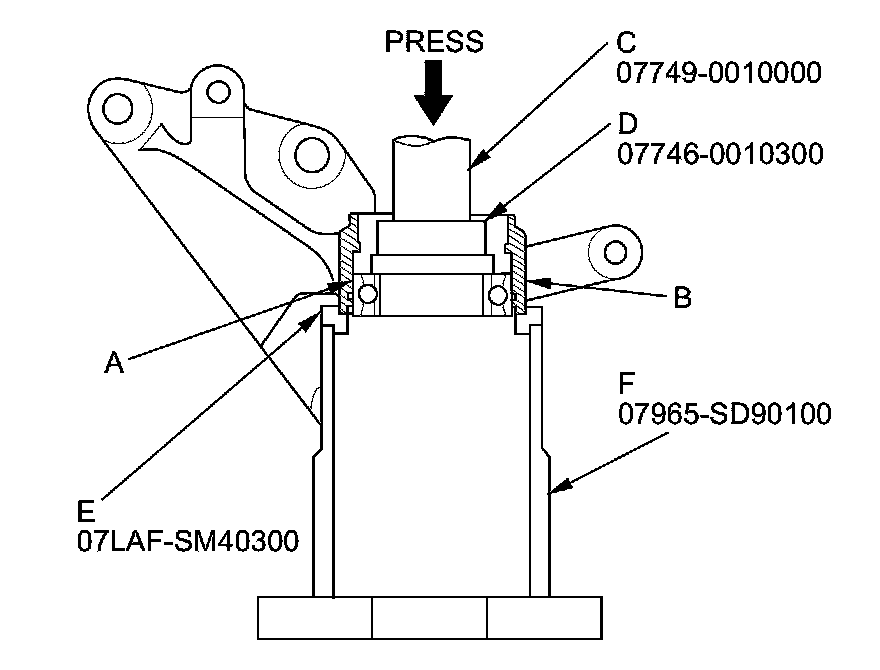 5. Press the intermediate shaft bearing (A) out of the bearing support (B) using the 15 x 135L driver handle (C), the 42 x 47 mm bearing driver attachment (D), the support base attachment (E), the support base (F), and a press.