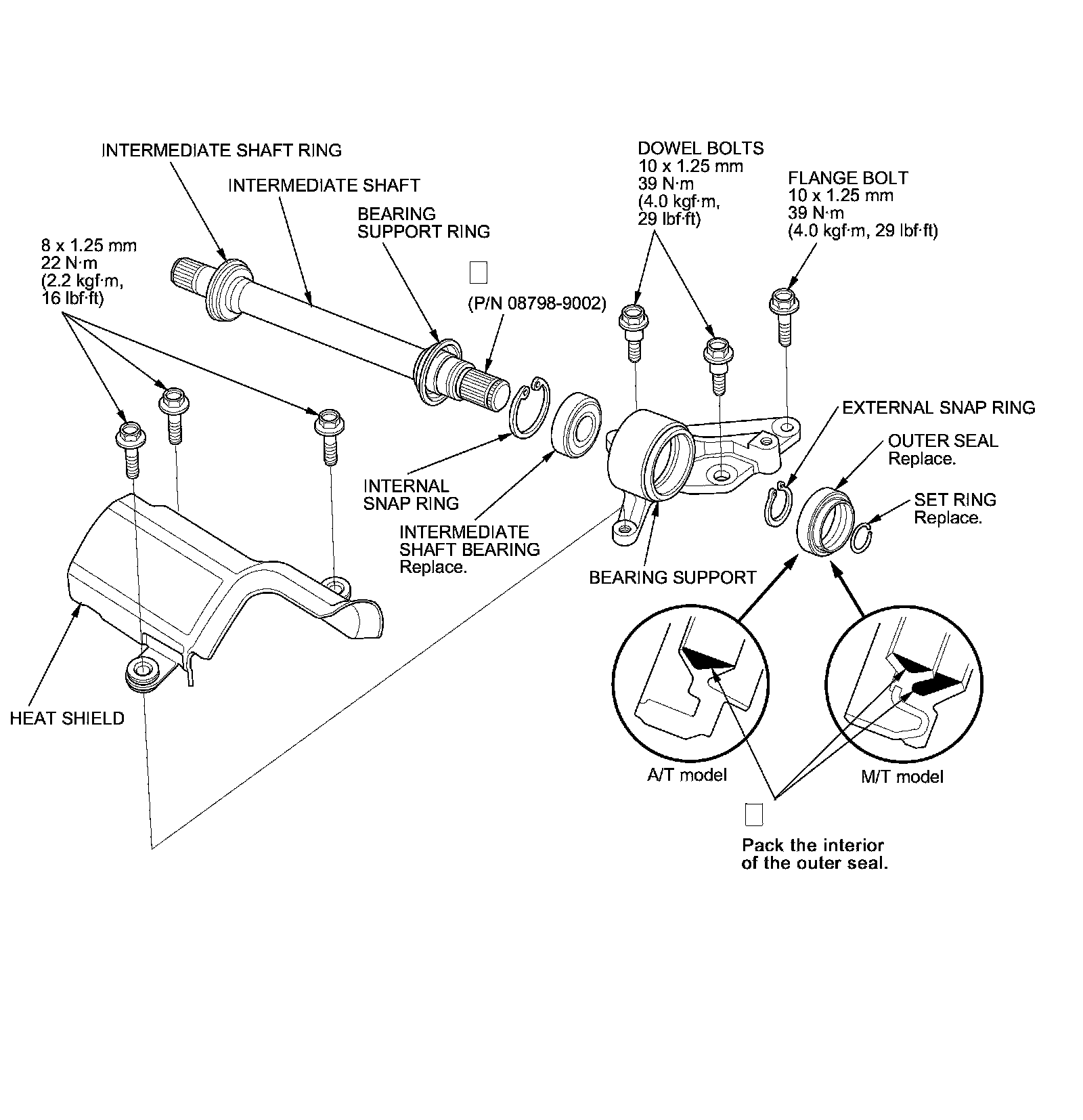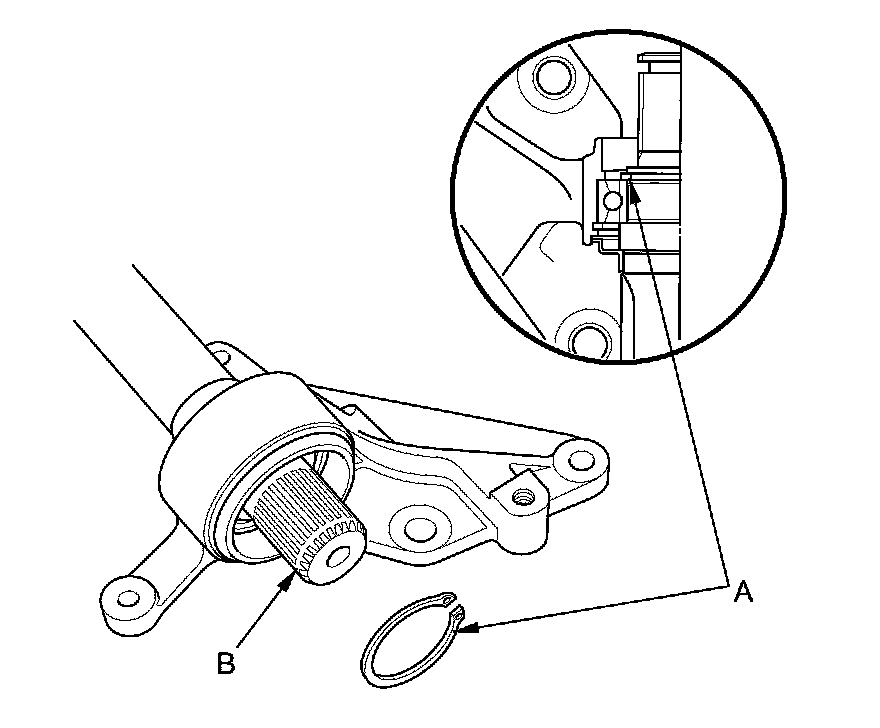 5. Install the external snap ring (A) into the groove of the intermediate shaft (B).