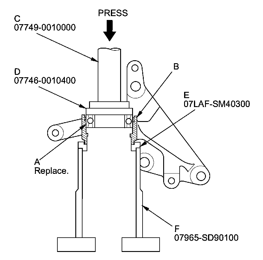 7. Install the new outer seal (A) into the bearing support (B) using the 46.2 mm fork seal driver (C), the support base attachment (D), the support base (E), and a press. Press in the seal flush with the surface of the bearing support. Then go to step 9.