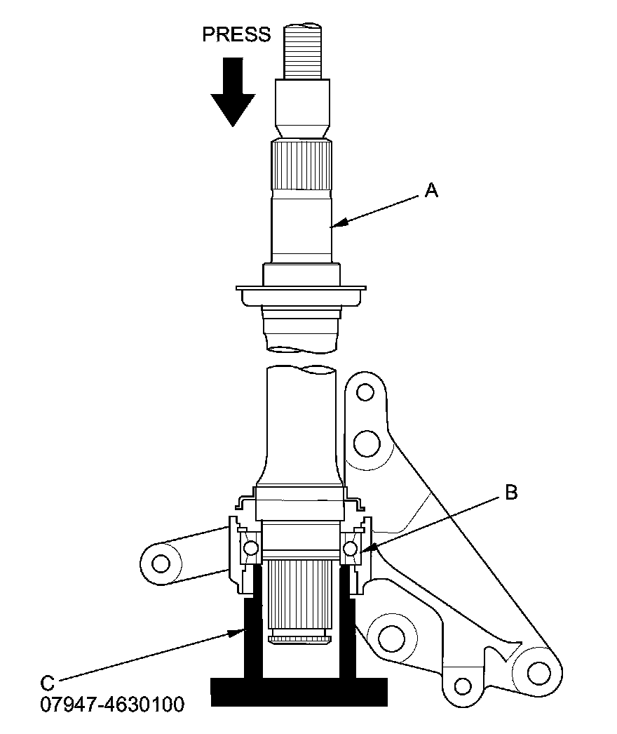 4. Press the intermediate shaft (A) into the shaft bearing (B) using the 39.2 x 49.5 x 15 mm fork seal driver (C) and a press.