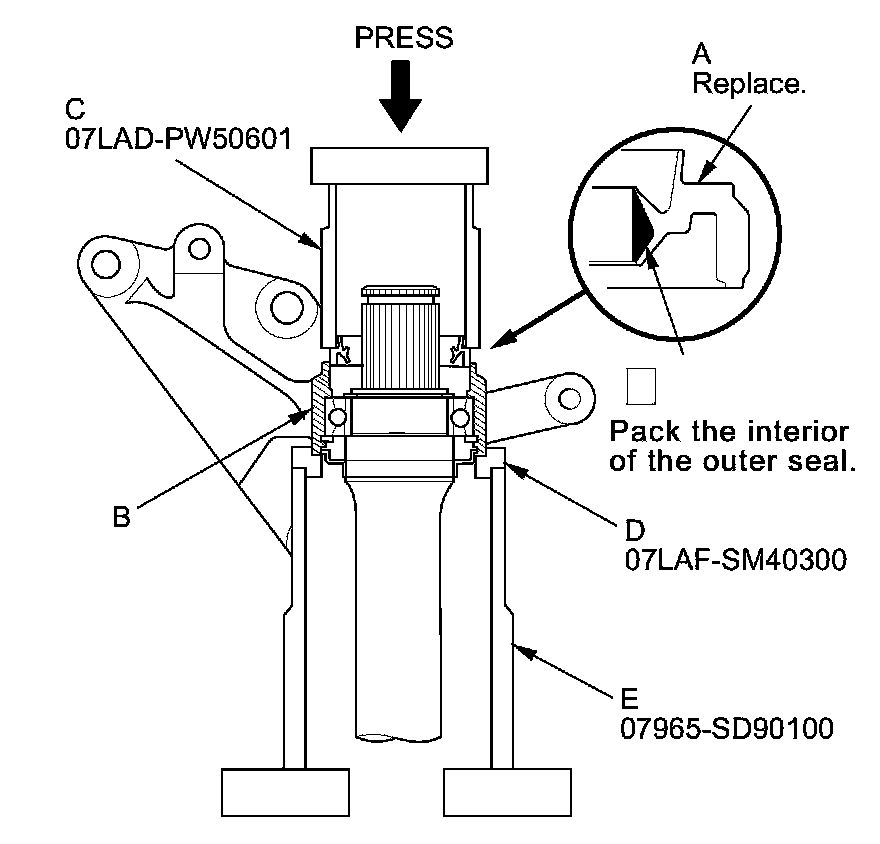 8. Install a new outer seal (A) into the bearing support (B) using the 40 x 50 mm attachment (C), the support base attachment (D), the support base (E), and a press. Press in the seal flush with the surface of the bearing support.