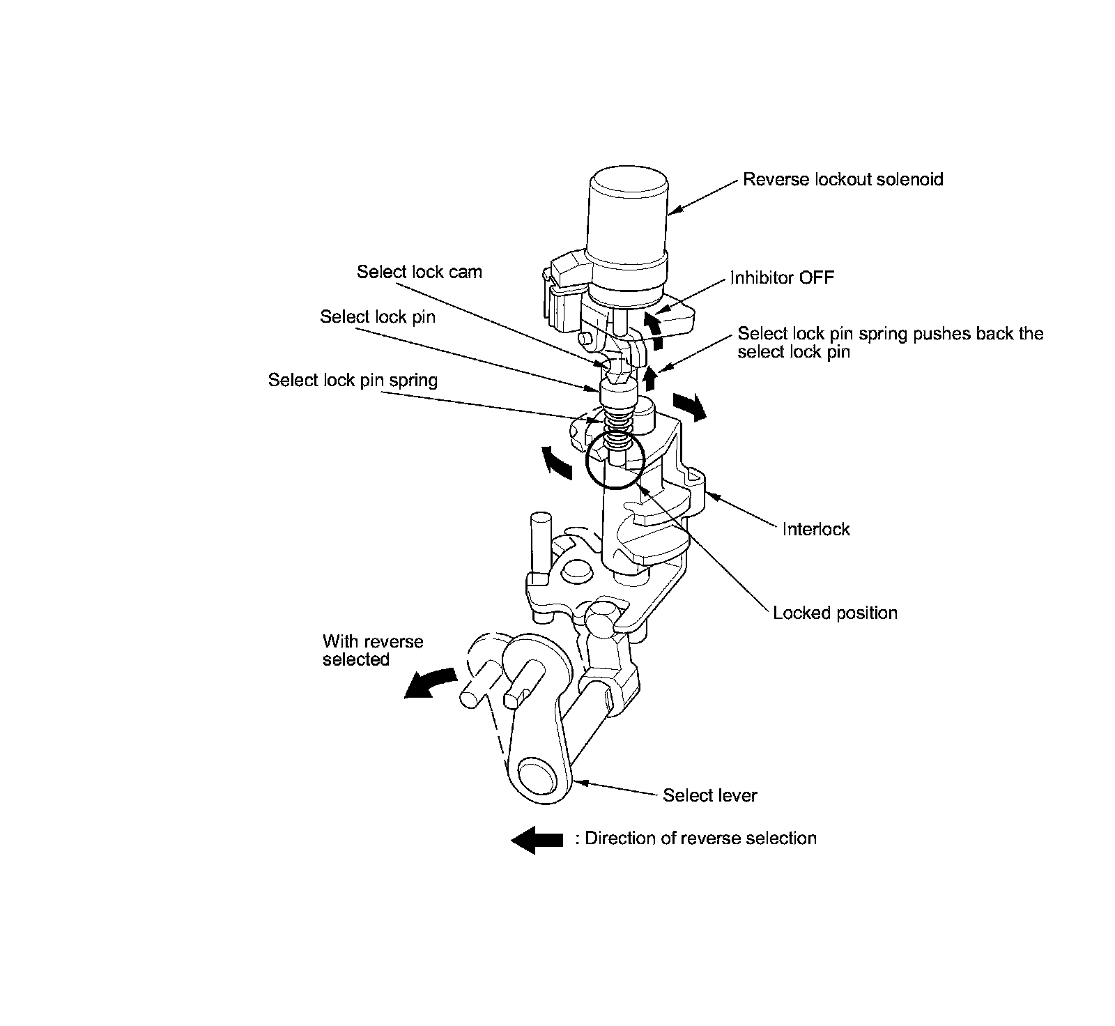At vehicle speeds of 12 mph (20 km/h) or more, the ECM, which monitors the signals from the output shaft (countershaft) speed sensor, activates the reverse lockout solenoid, which pushes the select lock cam and the select lock pin into the locked position. As a result, the interlock cannot rotate to the reverse select position, making it impossible to engage reverse gear. As the vehicle speed drops to of 9 mph (15 km/h) or less, the ECM turns off the reverse lockout solenoid. The select lock pin spring pulls back the select lock pin, enabling the interlock to move freely so reverse gear can be selected.