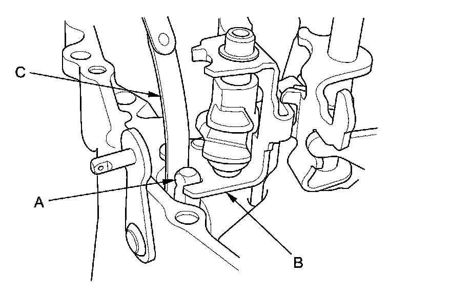 1. Measure the clearance between the select arm (A) and the interlock (B) with a feeler gauge (C). If the clearance exceeds the service limit, go to step 2.