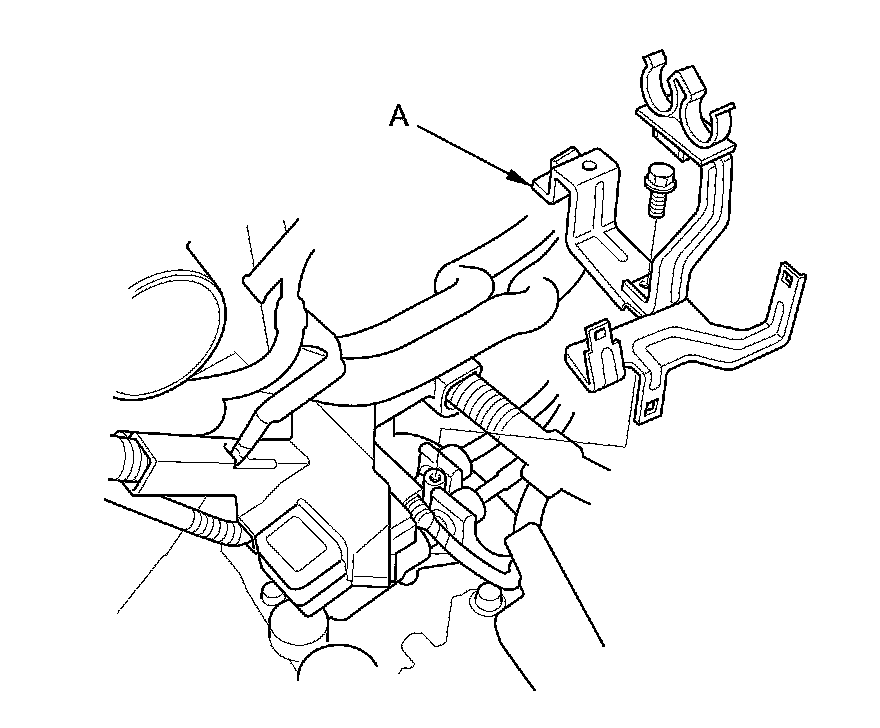 23. Remove the engine mount control solenoid valve bracket (A) from the rear cylinder head; use the bracket bolt hole to attach the attachment arm.