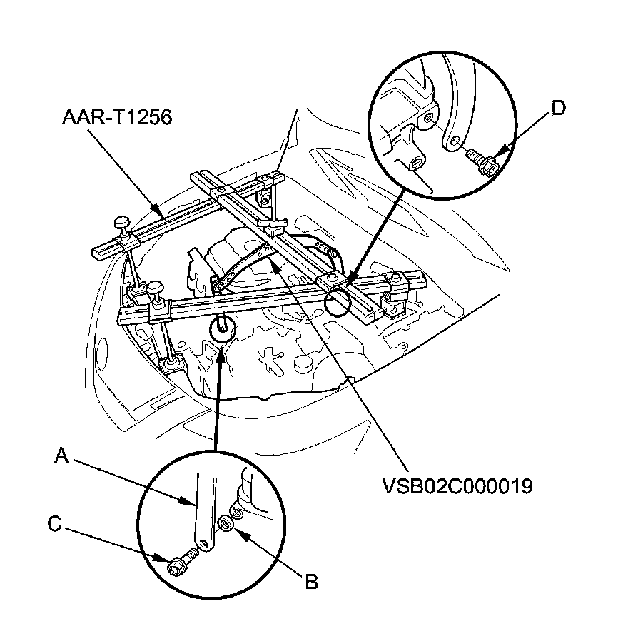 24. Lift and support the engine with the engine support hanger (AAR-T1256) and the engine hanger balance bar (VSB02C000019). Attach the front arm (A) to the front cylinder head with a spacer (B) and a 10 x 1.25 mm bolt (C). Attach the attachment arm (SIL02C000033) to the rear cylinder head with an 8 x 1.25mm bolt (D).