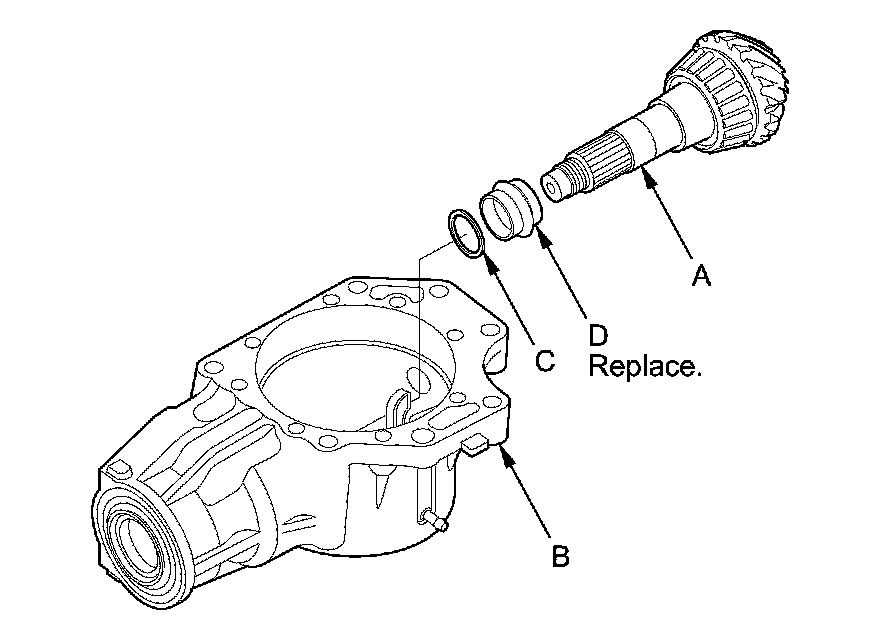 10. Remove the transfer output shaft (hypoid gear) (A) from the transfer housing (B), then remove the thrust washer (C) and the transfer spacer (D) from the transfer output shaft (hypoid gear).