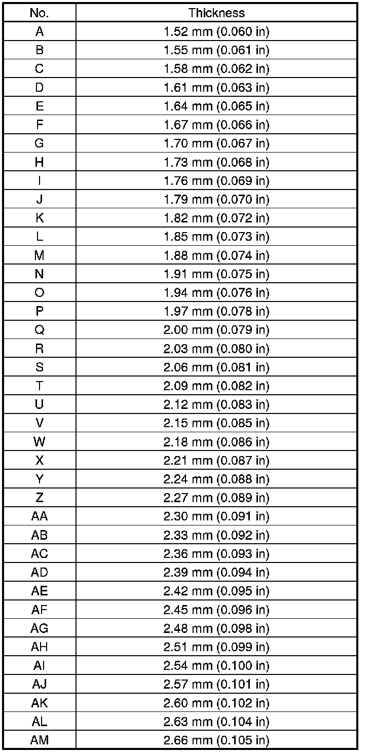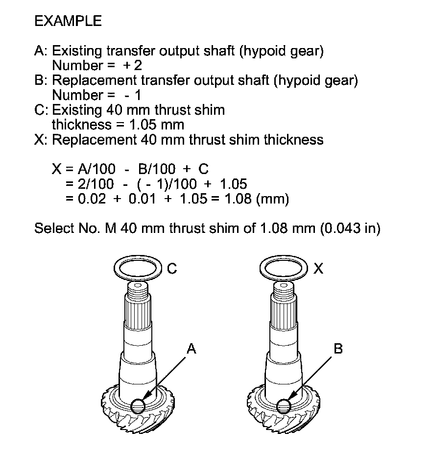 1. Select the 40 mm thrust shim if the transfer output shaft (hypoid gear) is replaced. Calculate the thickness of the 40 mm thrust shim using the following formula, and select the shim from the following table.