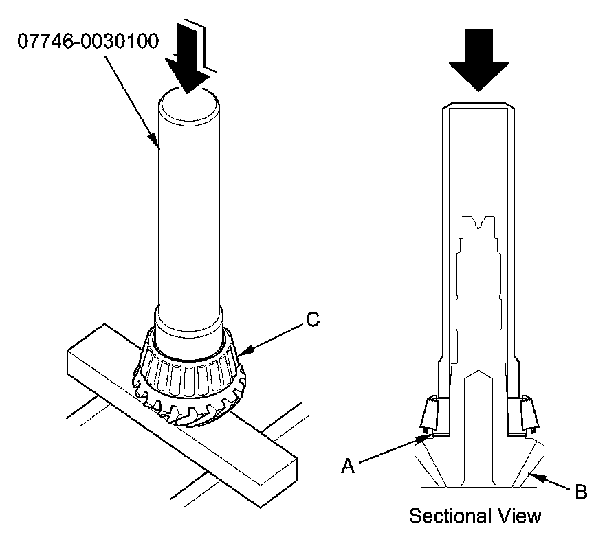 3. Install the 40 mm thrust shim (A) on the transfer output shaft (hypoid gear) (B), then install the tapered roller bearing (C) using the 40 mm driver handle and a press.
