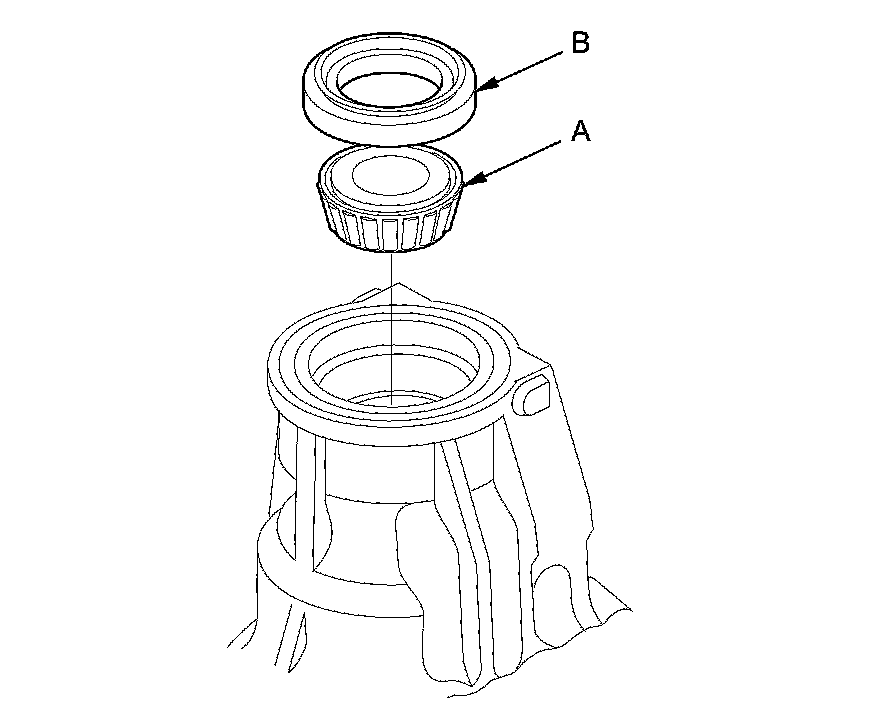 4. Place the tapered roller bearing (A) on the tapered roller bearing outer race of the companion flange side of the transfer housing, and install a new oil seal (B).