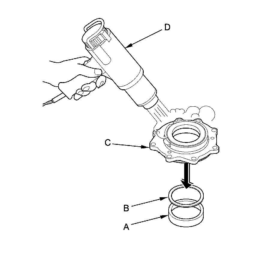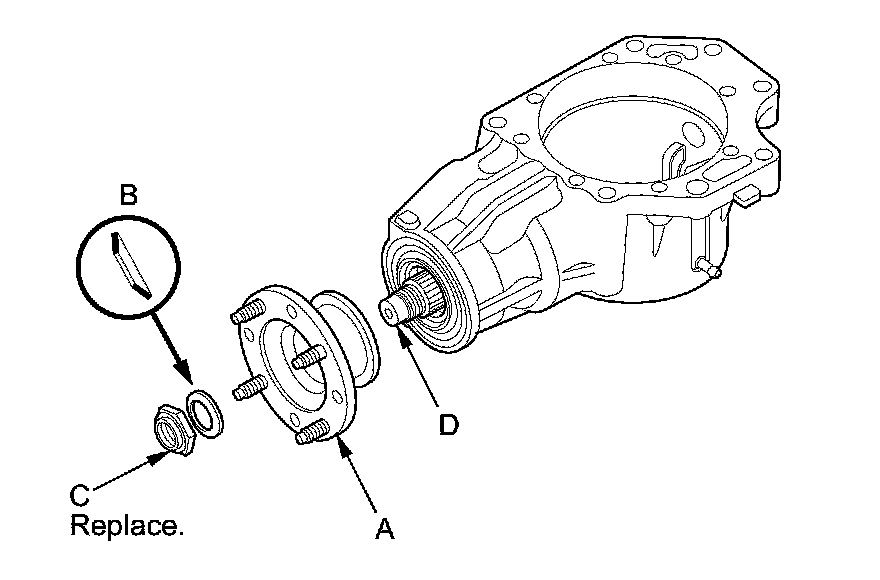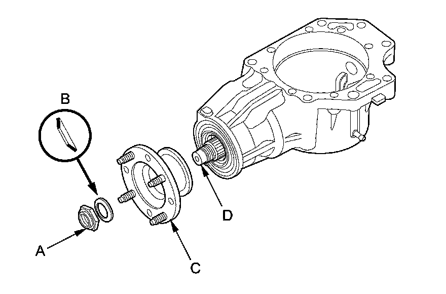 7. Install the companion flange (A), the conical spring washer (B) (in the direction shown), and a new locknut (C) on the transfer output shaft (hypoid gear) (D). Do not install the O-ring and the back-up ring.