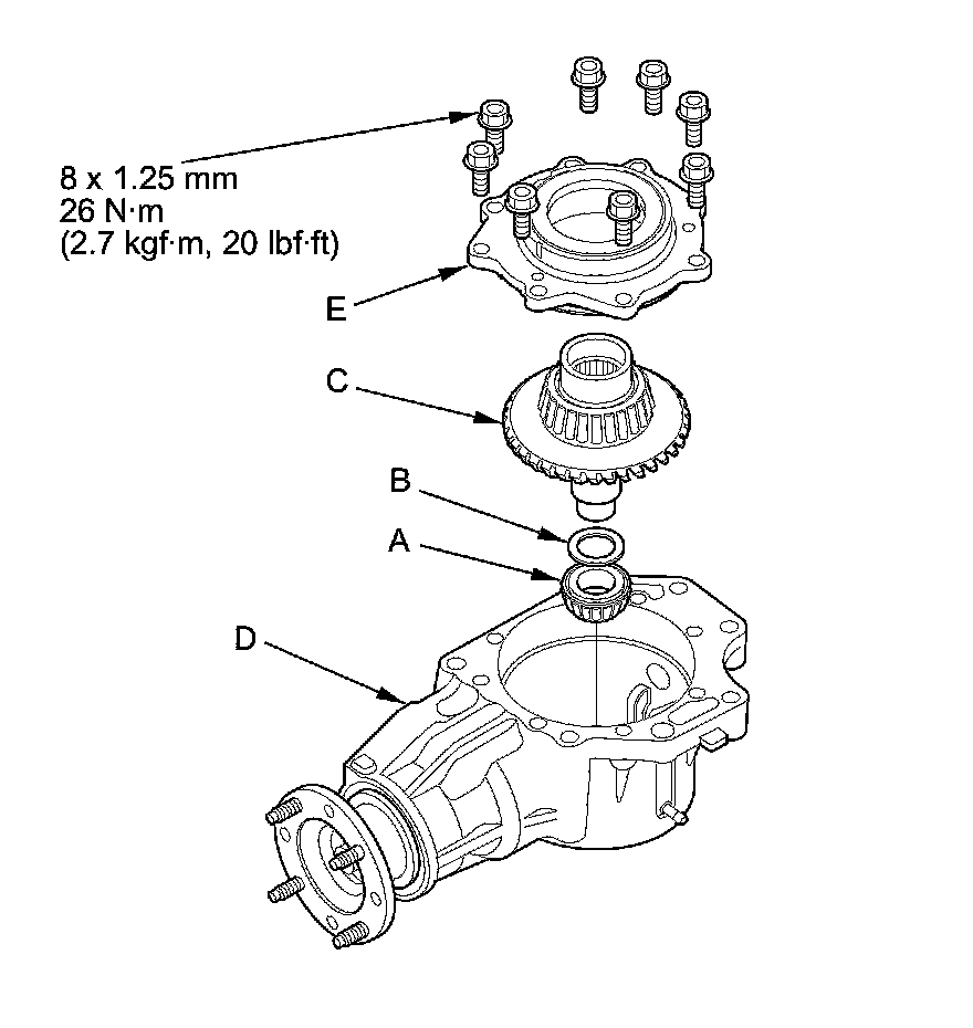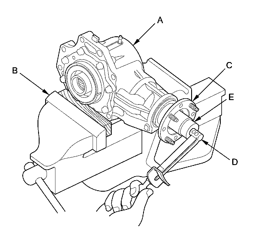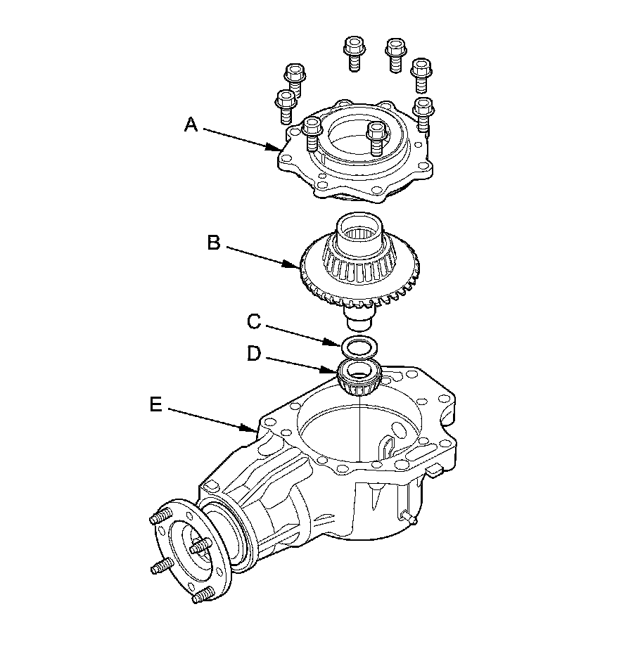 21. Remove the transfer cover (A), the transfer hypoid drive gear/shaft assembly (B), the 25 mm thrust shim (C), and the tapered roller bearing (D) from the transfer housing (E) after adjusting the transfer gear backlash or the transfer gear tooth contact.