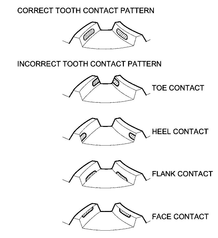 - Face Contact use a thinner 25 mm thrust shim to move the transfer hypoid drive gear toward the transfer output shaft (hypoid gear). Face contact must be adjusted within the limits of the transfer gear backlash. If the backlash exceeds the limits, adjust as described under Toe Contact.