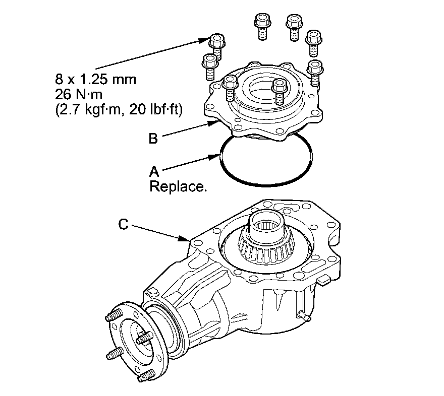 48. Install a new O-ring (A) on the transfer cover (B), then install the transfer cover on the transfer housing (C).