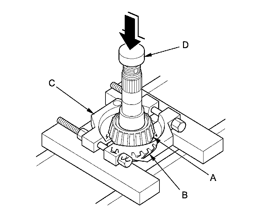 1. Remove the tapered roller bearing (A) from the transfer output shaft (hypoid gear) (B) using a bearing separator (C) and a press. Place a spacer (D) between the transfer output shaft and a press to prevent damaging the transfer output shaft.