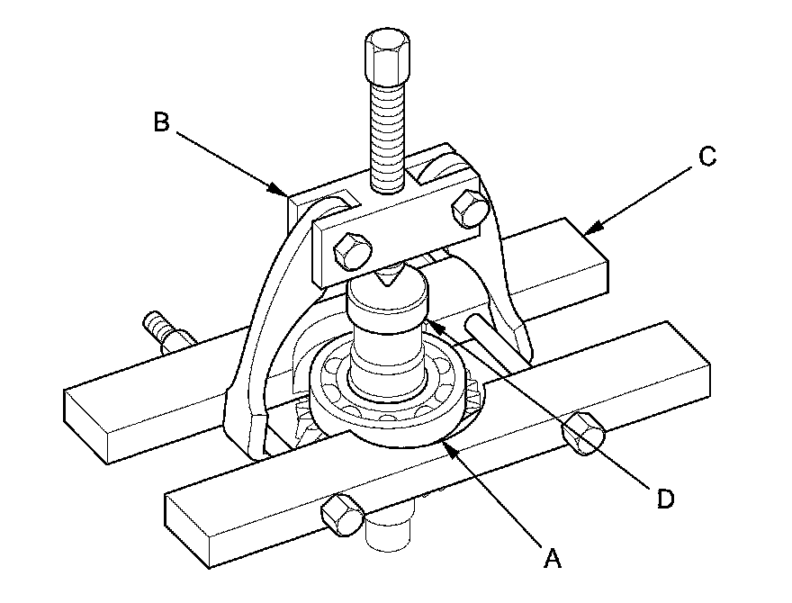 1. Remove the transfer output shaft bearing (A) using a commercially available puller (B), a bearing separator (C), and a spacer (D). Place the spacer between the transfer output shaft and the puller to prevent damaging the transfer output shaft.