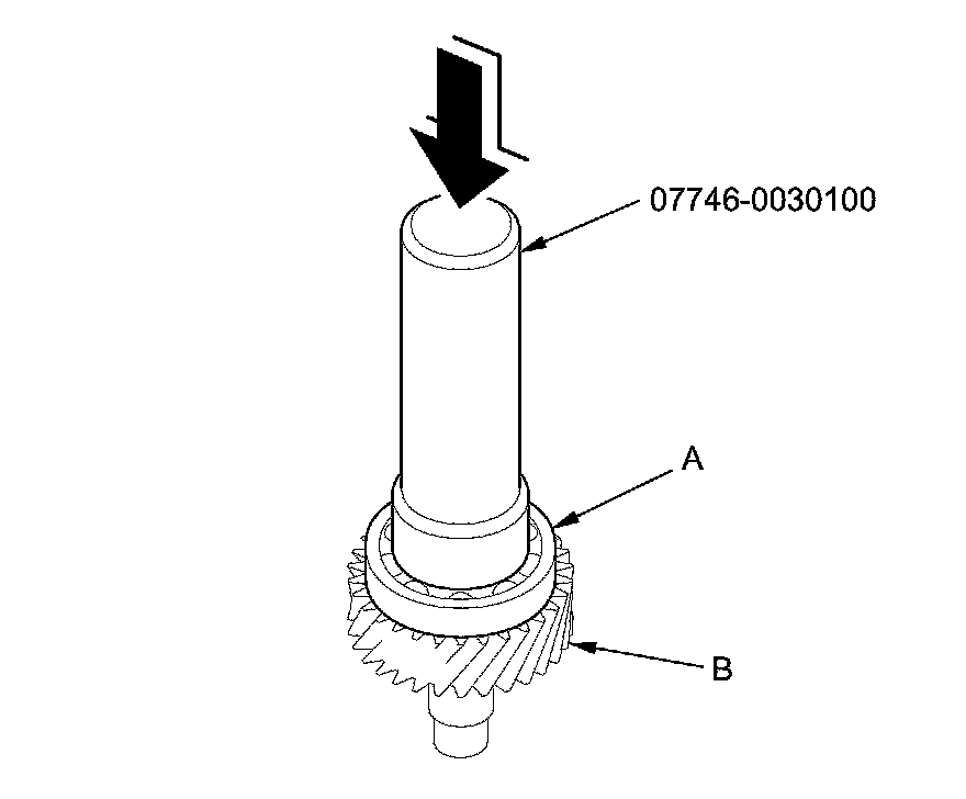 2. Install a new bearing (A) on the transfer output shaft (B) using the 40 mm driver handle and a press.