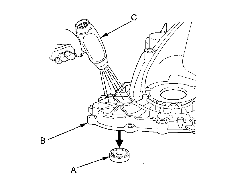 1. Remove the transfer output shaft bearing (A) from the transmission housing (B) by heating the transmission housing to about 212 °F (100 °C) using a heat gun (C). Do not heat the transmission housing more than 212 °F (100 °C).