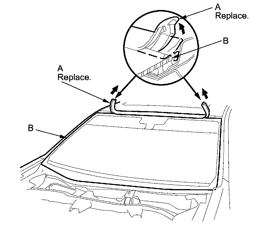 2. Remove the windshield molding (A) from the upper edge of the windshield (B). If necessary, cut the windshield molding with a utility knife.