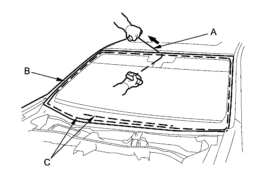 6. With a helper on the outside, pull the piano wire (A) back and forth in a sawing motion. Hold the piano wire as close to the windshield (B) as possible to prevent damage to the body and the dashboard. Carefully cut through the rubber dam and the adhesive (C) around the entire windshield.