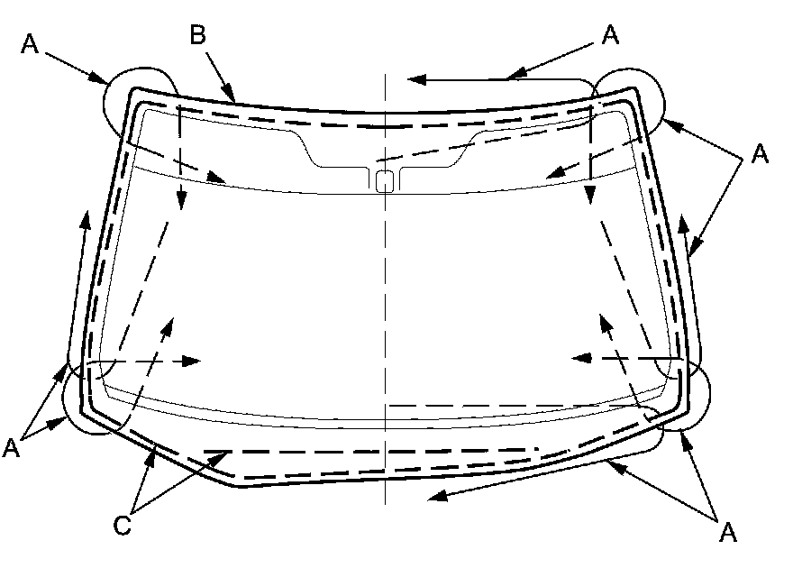 18. Apply a light coat of glass primer to the windshield (A) along the edge of the windshield molding (B) and the rubber dams (C) as shown, then lightly wipe it off with a gauze or a cheesecloth: