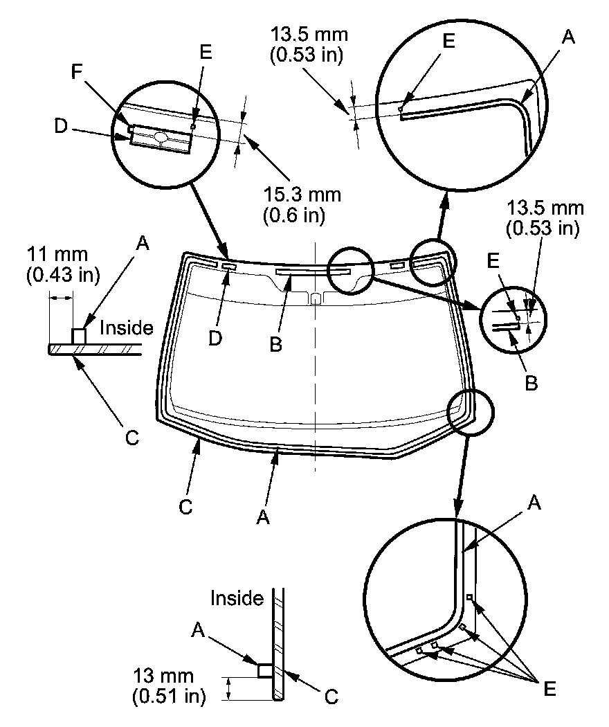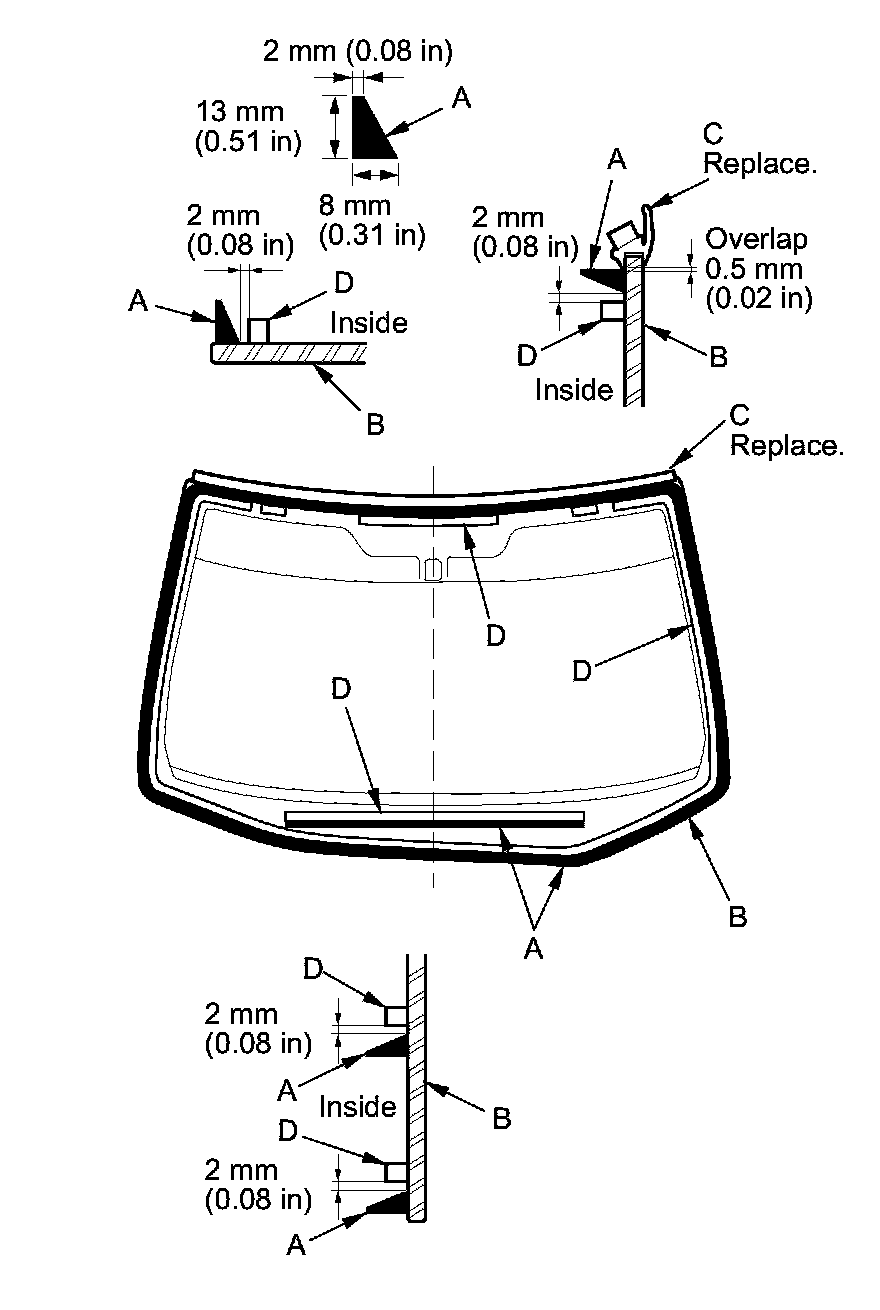 12. Apply glass primer to the upper clip mounting areas on the windshield (C), and let it dry. Remove the adhesive backing and attach the rubber dam A, B and the upper clips (D) to the inside of the windshield as shown: