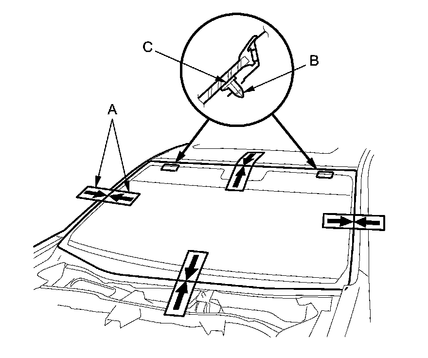 16. Set the windshield in the opening, and center it. Make alignment marks (A) across the windshield and the body with a grease pencil at the four points shown. Make sure the pins (B) of both upper clips (C) contact with the edge of the body holes. Be careful not to touch the windshield where the adhesive will be applied.