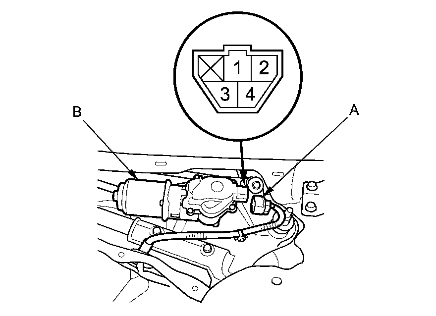 3. Disconnect the 4P connector (A) from the windshield wiper motor (B).