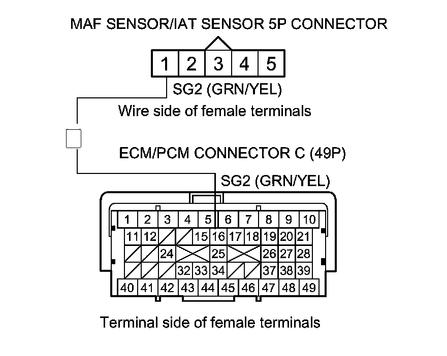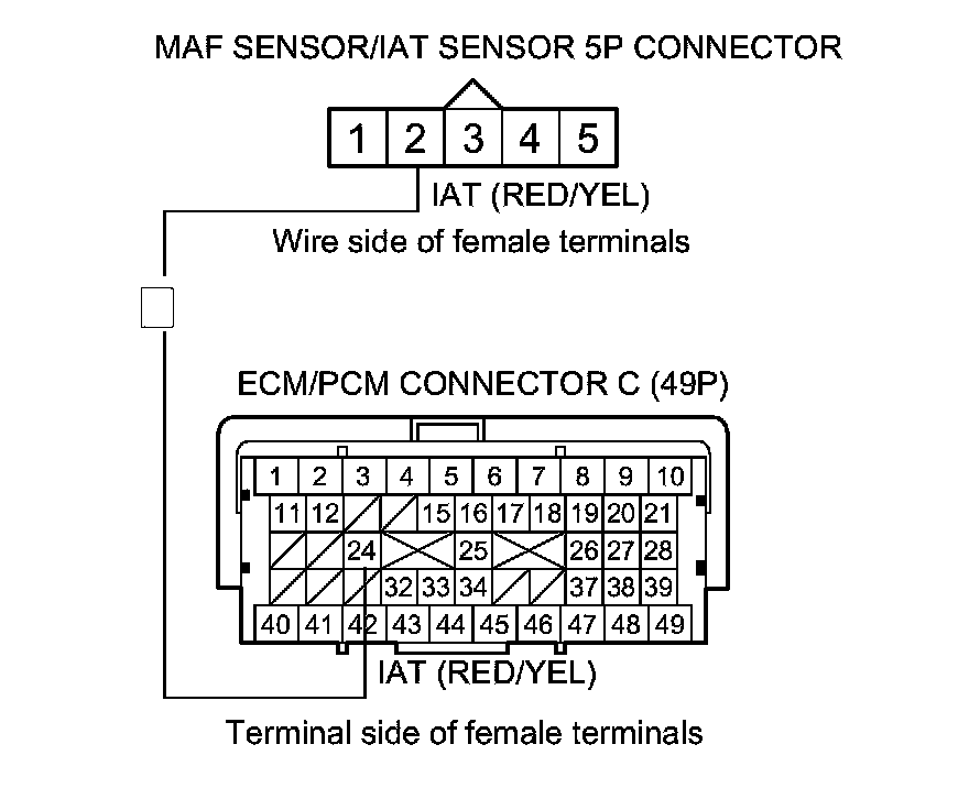 19. Check for continuity between ECM/PCM connector terminal C24 and MAF sensor/IAT sensor 5P connector terminal No. 2.