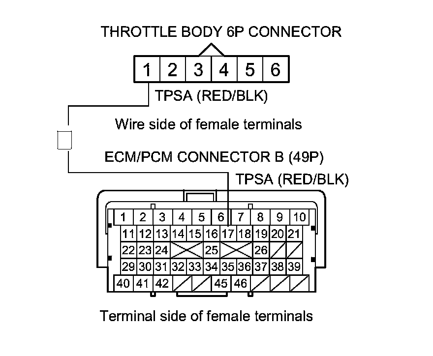 12. Check for continuity between ECM/PCM connector terminal B17 and throttle body 6P connector terminal No. 1.